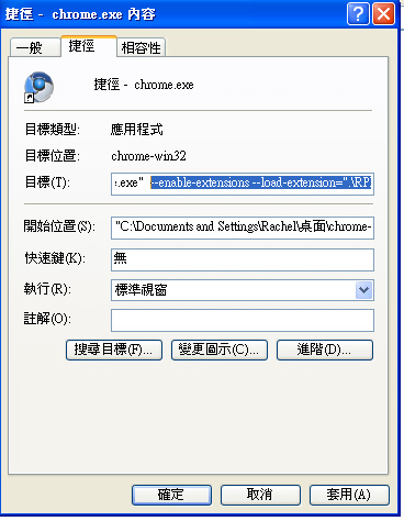*修改捷徑內容 , 於捷徑->目標空一格加入--enable-extensions --load-extension=".\RPlurkSmileys"