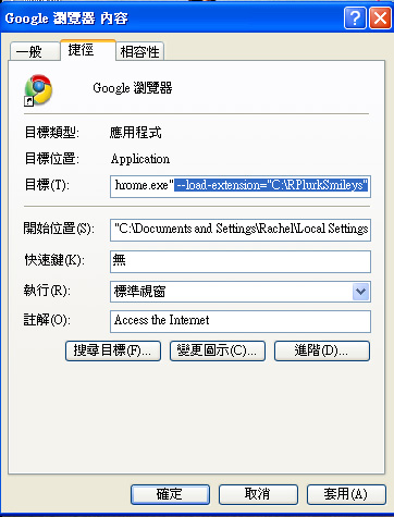 *在"目標"欄位最後空一格加上--load-extension="C:\RPlurkSmileys"